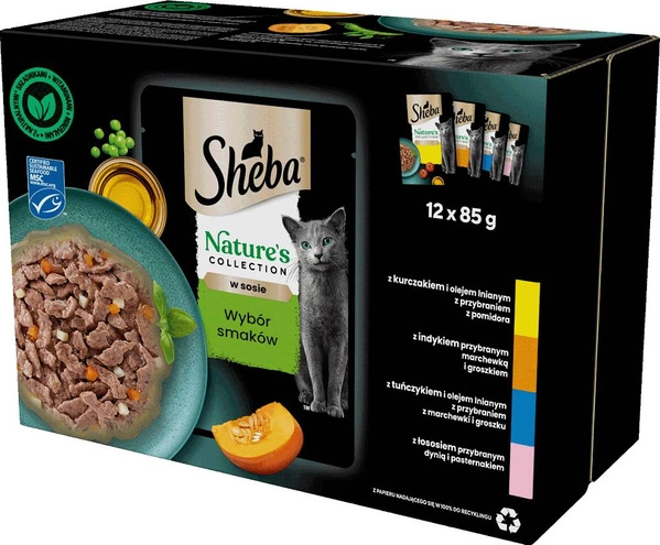 Receptura karmy Sheba została oparta o założenie, że skoro koty są z natury mięsożercami, głównym komponentem ich diety powinno stanowić świeże mięso, zarówno zwierząt rzeżnych jak i ryb. Dlatego dania dla kotów Sheba składają się w 40% z produktów mięsnych. Karmy produkowane przez Sheba są pełnoporcjowe, co oznacza, że spełniają aktualne normy żywieniowe (FEDIAF)i dostarczają zwierzętom wszystkich potrzebnych składników odżywczych. Mokra karma Sheba dostępna jest w opakowaniach stanowiących porcję na jeden posiłek. Linia obejmuje bogatą kolekcję wyselekcjonowanych smaków.