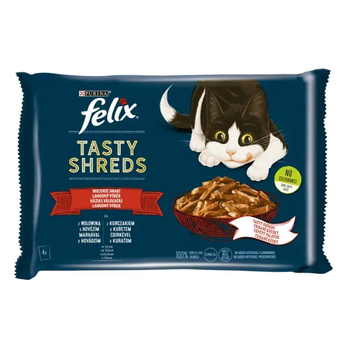 FELIX® Tasty Shreds – Wiejskie smaki z wołowiną i kurczakiem 4x85g