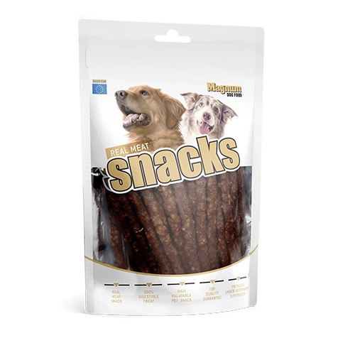 MAGNUM Kabanosy z jagnięciną i ryżem to przysmaki w formie miękkich, cienkich kiełbasek, które można łatwo dzielić na mniejsze kawałki. Wykonane z 100% mięsa jagnięcego i ryżu, są lekkostrawne, dobrze tolerowane i odpowiednie także dla psów z wrażliwym układem pokarmowym. Idealne do treningów, nagradzania i jako szybka przekąska między posiłkami.