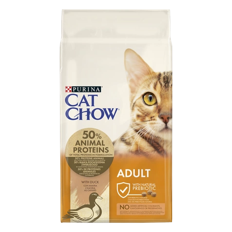 Purina Cat Chow jest starannie opracowana z użyciem wysokiej jakości białka i naturalnych składników, takich jak groszek, marchew, pełnoziarniste zboża, cykoria i drożdże. Karma Cat Chow jest stworzona z kaczką, a ponad 50 % całkowitego białka pochodzi ze źródeł zwierzęcych, aby zaspokoić naturalne potrzeby Twojego kota. Receptura zawiera również cykorię, naturalne źródło prebiotyków, które, jak udowodniono, przyczynia się do poprawy zdrowego trawienia, dzięki czemu Twój kot czerpie więcej z karmy. Stworzona w oparciu o nasze wieloletnie doświadczenie w żywieniu kotów od 1926, karma Cat Chow to w 100 % pełnoporcjowe i zbilansowane żywienie zapewniające wszystko czego Twój kot potrzebuje do beztroskiego i zdrowego życia.