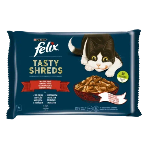 FELIX® Tasty Shreds to delikatne, szarpane kawałki mięsa w pysznym sosie, które Twój kot pokocha już od pierwszej miski! Każda saszetka została przygotowana w odpowiedniej temperaturze, a następnie pocięta na miękkie kąski, aby zapewnić niezrównany smak i aromat. To w 100% pełnoporcjowa i zbilansowana karma, odpowiednia również dla kotów wysterylizowanych.