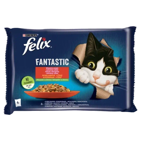 FELIX® Fantastic Wiejskie Smaki to pełnoporcjowa karma dla dorosłych kotów, która łączy smak mięsa i warzyw w soczystej galaretce. Zestaw zawiera dwa warianty – kurczaka z pomidorami oraz wołowinę z marchewką. Dzięki zbilansowanej formule i wysokiej jakości składnikom, posiłki wspierają codzienną energię, odporność i zdrowy wygląd sierści pupila.