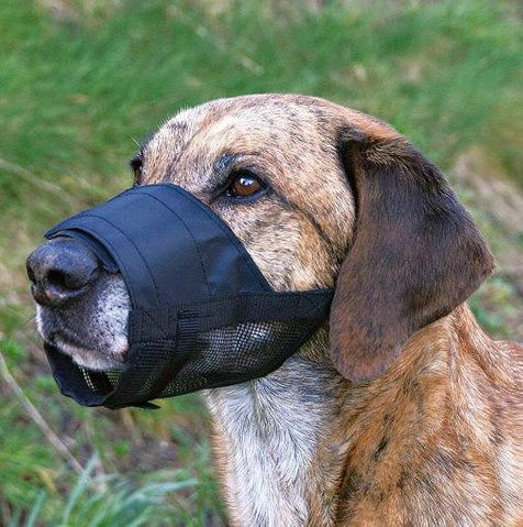 - Materiałowy kaganiec wykończony siateczką dla psa, o obwodzie kufy 14-22cm.