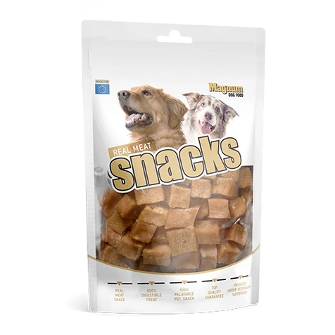 MAGNUM Kostki kurczak z dorszem to lekkie, 100% naturalne przysmaki dla psów, które łączą delikatność mięsa z kurczaka z wartościami odżywczymi dorsza. Idealne do nagradzania podczas treningu, spacerów czy podróży. Miękkie i dobrze przyswajalne – sprawdzą się także u psów z wrażliwym żołądkiem.