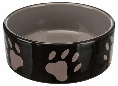 - Ekskluzywnie wyglądająca ceramiczna miska w kolorze czarnym, zdobiona szarym motywem łapek na obwodzie, wewnątrz szara emalia.