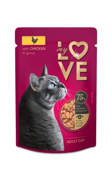 My Love z kurczakiem w sosie to pełnoporcjowa mokra karma dla dorosłych kotów, przygotowana z myślą o zdrowiu i witalności Twojego pupila. Zawiera aż 75% mięsa i produktów pochodzenia zwierzęcego w kawałkach, w tym 11% kurczaka – lekkostrawnego źródła białka, które wspiera budowę mięśni i regenerację organizmu.