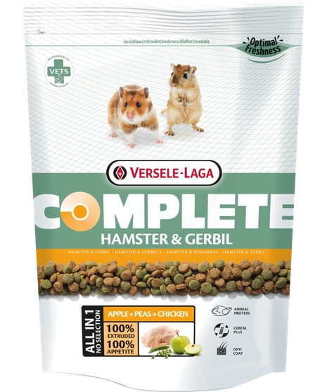 Pokarm zawierający kurczaka, jako naturalne źródło zwierzęcych protein oraz zboża dające energię i witalność dostosowany jest do potrzeb żywieniowych chomików i myszoskoczków. Versele-Laga Complete Hamster & Gerbil został przygotowany przez lekarzy weterynarii w oparciu o zaawansowane badania.
