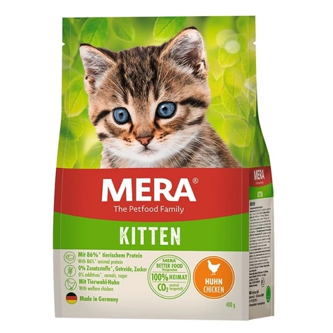 Pełnoporcjowa karma dla kociąt (od drugiego do dwunastego miesiąca życia). Rozmiar krokietów jest odpowiednio dopasowany do wielkości kociąt. Karma Mera Cats Kitten Chicken została wytworzona z dużej ilości świeżego mięsa z kurczaka, nie zawiera zbóż ani cukru. Zaspokaja wszystkie potrzeby pokarmowe młodych kotów w okresie wzrostu i rozwoju. Zawiera siarę oraz mannanooligosacharydy i beta-glukany, które wywierają korzystny wpływ na układ odpornościowy.