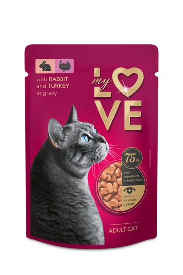 My Love z indykiem i królikiem w sosie to pełnoporcjowa mokra karma, która łączy delikatny smak drobiu z lekkostrawnym mięsem królika. Zawiera aż 75% mięsa i produktów pochodzenia zwierzęcego w kawałkach, w tym 4% z królika i 4% z indyka, co gwarantuje wysoką smakowitość i odpowiednią dawkę białka.