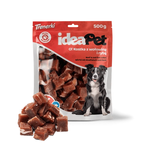 ideaPet Kostka z wołowiną i rybą to smakowity przysmak dla psa, który łączy wołowinę, mięso z kaczki, dorsza oraz płuca wołowe, zapewniając wyjątkowy smak i wartości odżywcze. Wołowina i płuca wołowe dostarczają cennego białka oraz wspomagają zdrowie mięśni i regenerację tkanek, a mięso z kaczki jest lekkostrawne i bogate w aminokwasy oraz minerały. Dorsz natomiast, będący źródłem kwasów omega-3, korzystnie wpływa na kondycję skóry i sierści. Kostki mają formę łatwych do pogryzienia kawałków, co sprawia, że są idealne dla psów w każdym wieku.