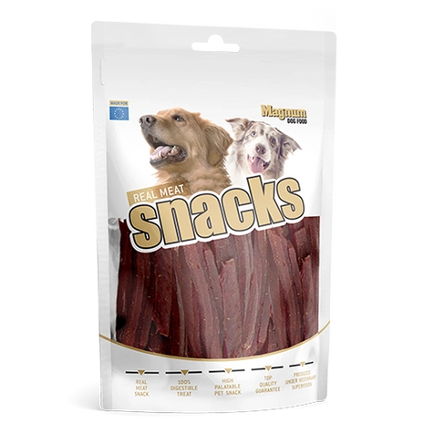 MAGNUM Miękkie paski z kaczki to przysmak premium stworzony z czystego, delikatnego mięsa kaczki. Miękka i elastyczna konsystencja sprawia, że paski można z łatwością dzielić na mniejsze kawałki – co czyni je idealną nagrodą podczas treningu, zabawy lub w podróży. Są lekkostrawne, bezpieczne dla zębów i świetnie przyswajalne.