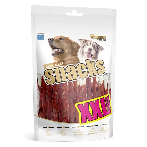 MAGNUM Patyczki z kaczką to smakołyki, które łączą intensywny smak mięsa z kaczki z naturalną skórą wołową w środku. Taka forma przysmaku doskonale sprawdza się jako nagroda lub zajęcie na dłużej – psy mogą żuć, smakować i jednocześnie wspierać higienę jamy ustnej.