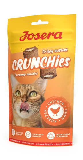 Wow, ale chrupiące! Nasze przekąski Josera Crunchies Chicken oferują o wiele więcej - ponieważ wypełnione są kremowym nadzieniem z pysznym kurczakiem dla głodnych kociaków! Te bezzbożowe i niskokaloryczne przysmaki to idealna przekąska na każdy dzień.